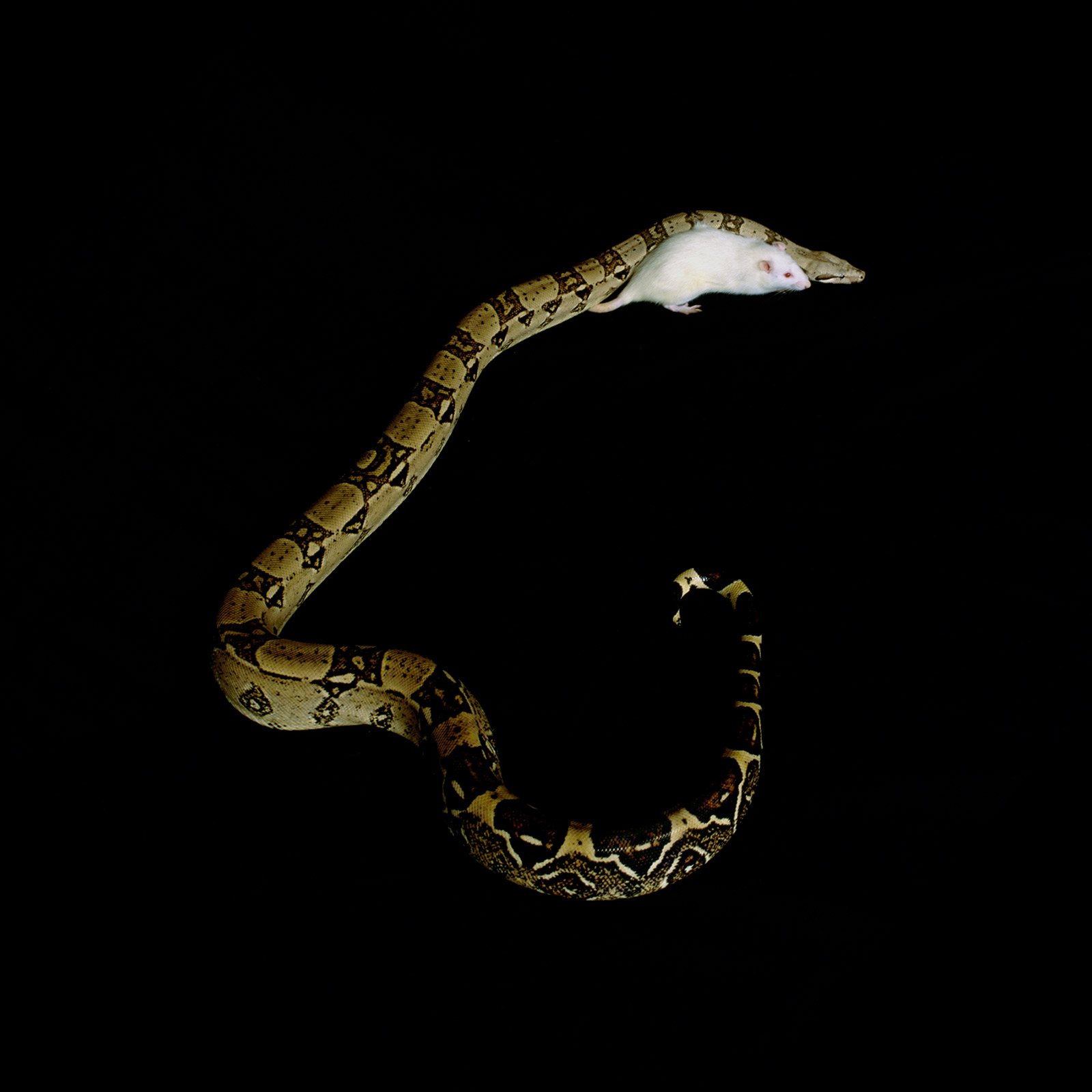 While working on Animal Crossdressing, an interesting side project materialized. The pet snake that I was working with, Carla, had befriended a rat that was initially given to her to eat. They had been cohabitating for weeks at the point when I met them (the snake had eaten other rats but wouldn't touch this one). The animals were completely comfortable with each another and I produced a series of photographs that documents their interaction. This idealized "friendship" was easy to embrace, and the images aimed to place the viewer in a double bind: should this highly unnatural state of affairs be accepted and sentimentally celebrated?