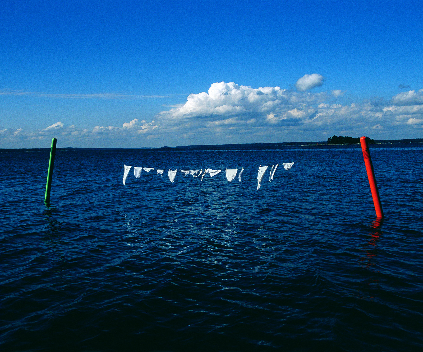 I spotted two sea markers which were situated conveniently close to one another. My mother and I hung up the laundry on a line between them very early in the morning before there was a lot of boat traffic.