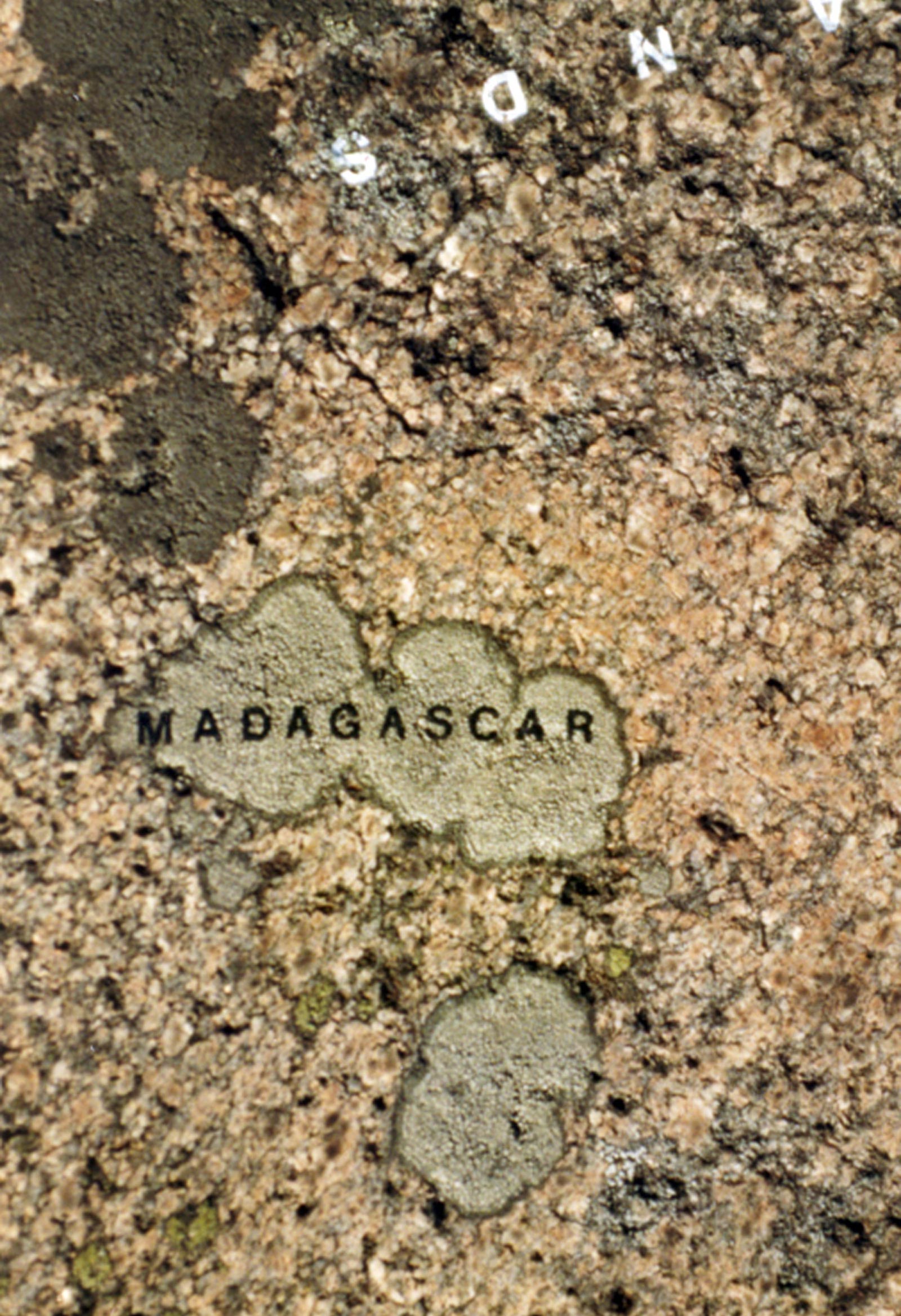 There is a type of lichen which is very common in the Finnish archipelago and my family's summer house sits on a large granite hill covered with it. I have always seen certain shapes as islands or continents and decided to affix dry transfer lettering directly to the lichens to identify them as the places I recognized. When I had finished, the whole hill had become a kind of scrambled atlas.