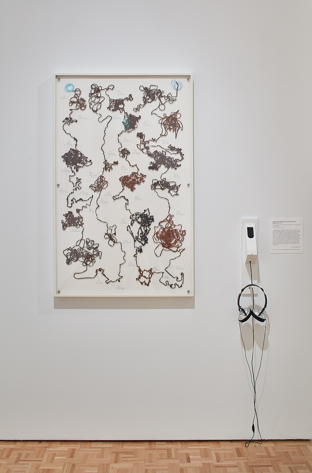 Songs of the Islands: Concrete Music from New York, 1996-1998. Found audiotape between Plexiglas, paper board, ink, soundtrack, audio player with headphones. 40 × 30 × 2 inches (102 × 76 × 5 cm).