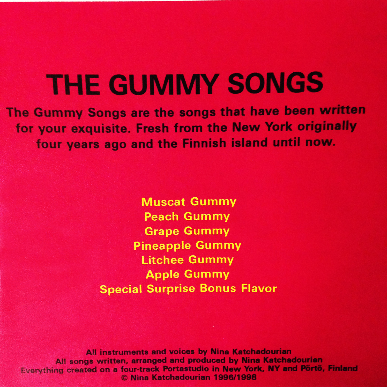 Several other “gummy songs” followed, all taking their cue from the text on the respective bag flavor. I played guitar and a variety of minor instruments, including a tiny Casio keyboard with some preset riffs I made enthusiastic use of. I sang all the vocal parts. The songs were written and recorded in New York, NY and Pörtö, Finland over a period of about two years. I performed them live only once (circa 2000 at The Knitting Factory in downtown Manhattan) with “The Gummy Choir,” three women friends (Clare Ellis, Ellen Santiniello, and Gina Kaufmann) who joined me for special arrangements of the songs that we worked out for the occasion.
